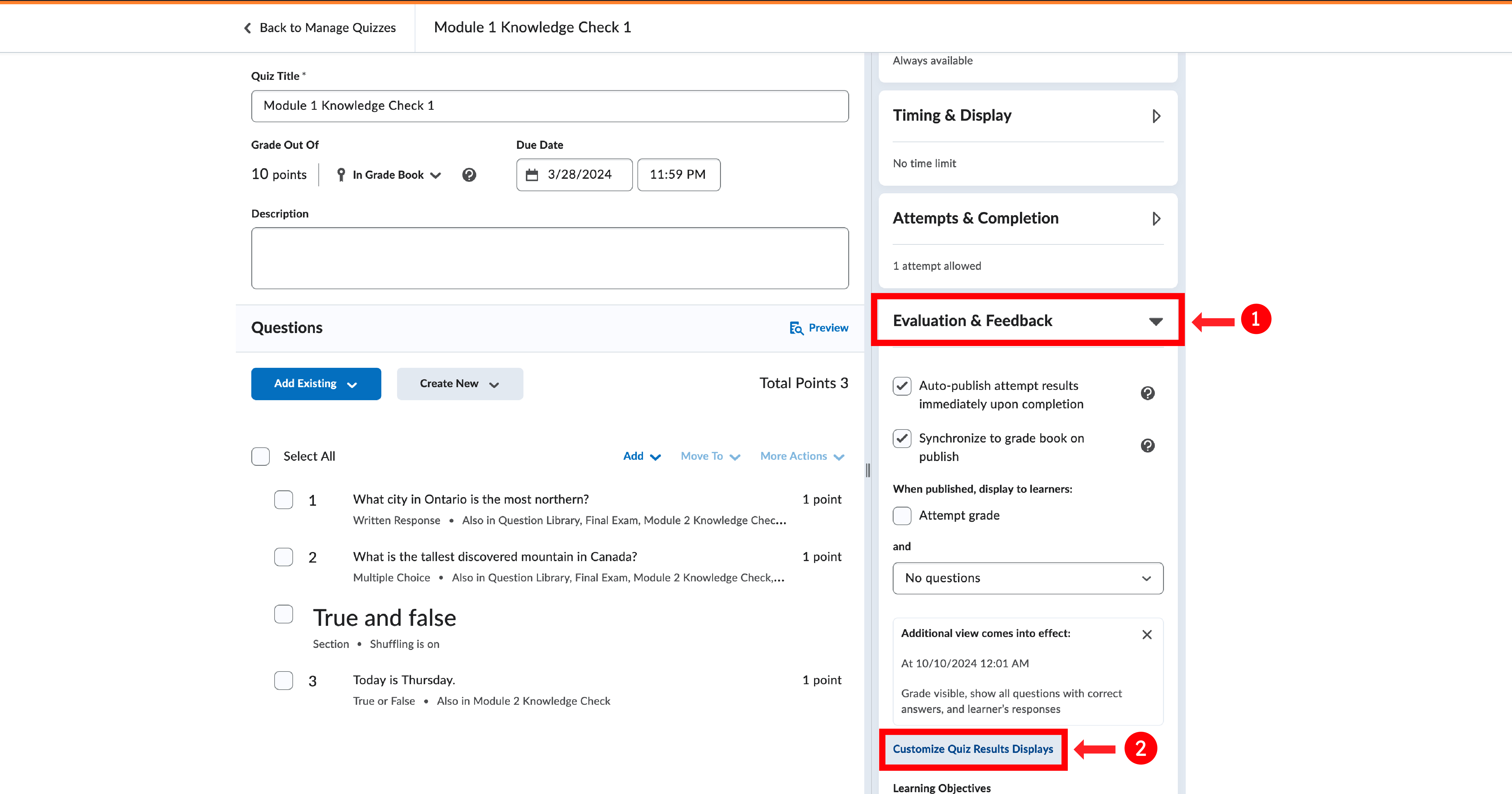 1. In the quiz editor, under the evaluation and feedback section, check the "auto-publish" and "synchronize to the grade book" boxes (if the quiz counts towards the final grade).