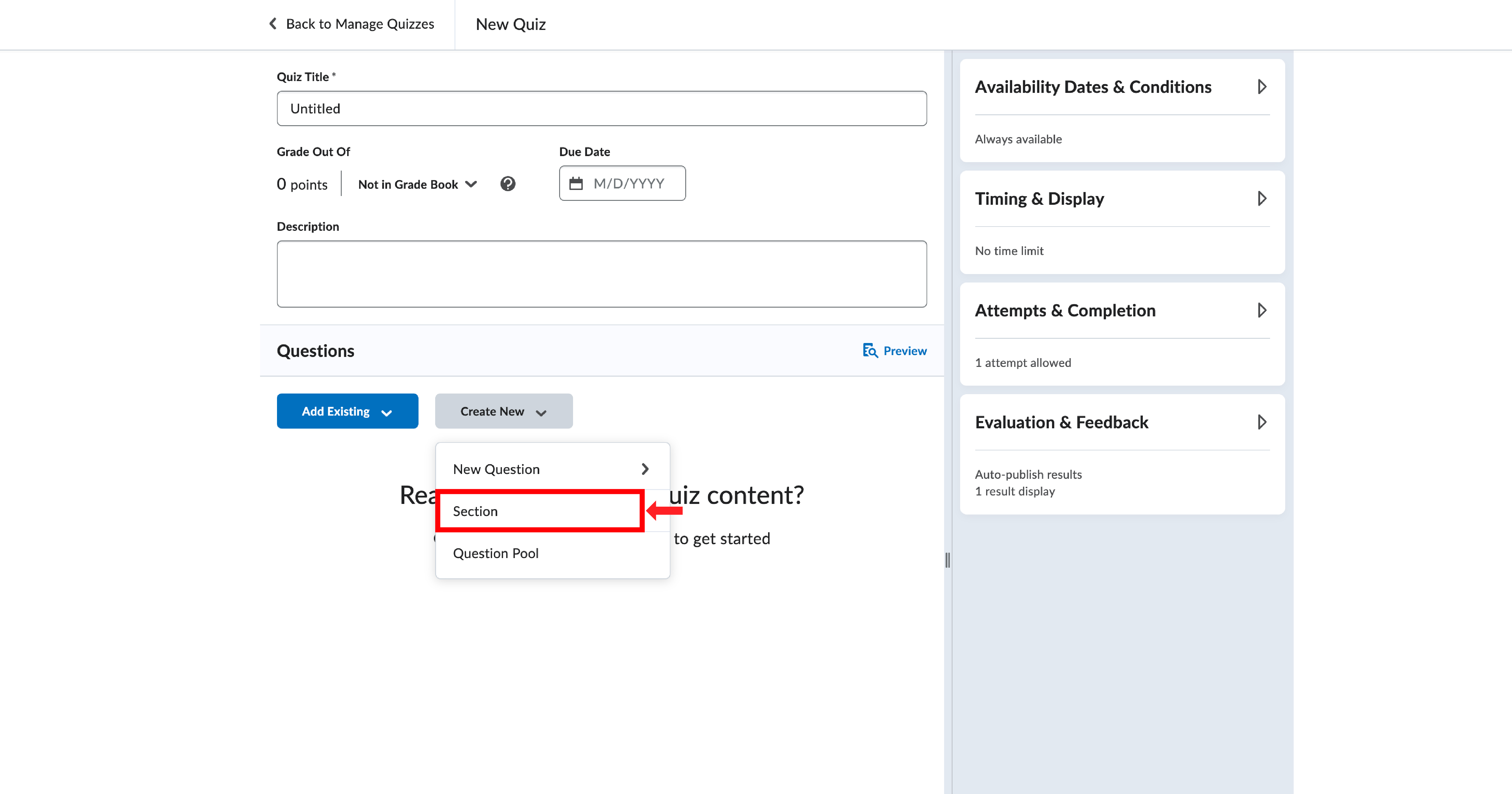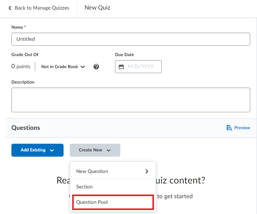 4. In the quiz editor, choose the "Question Pool" option under "Create New".
