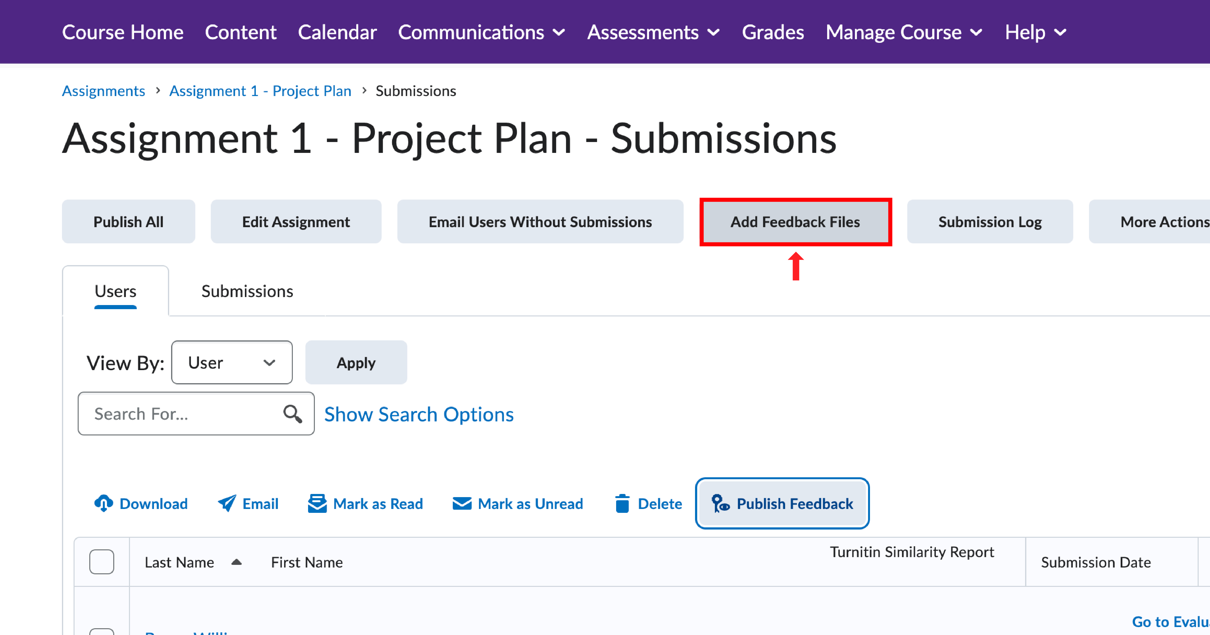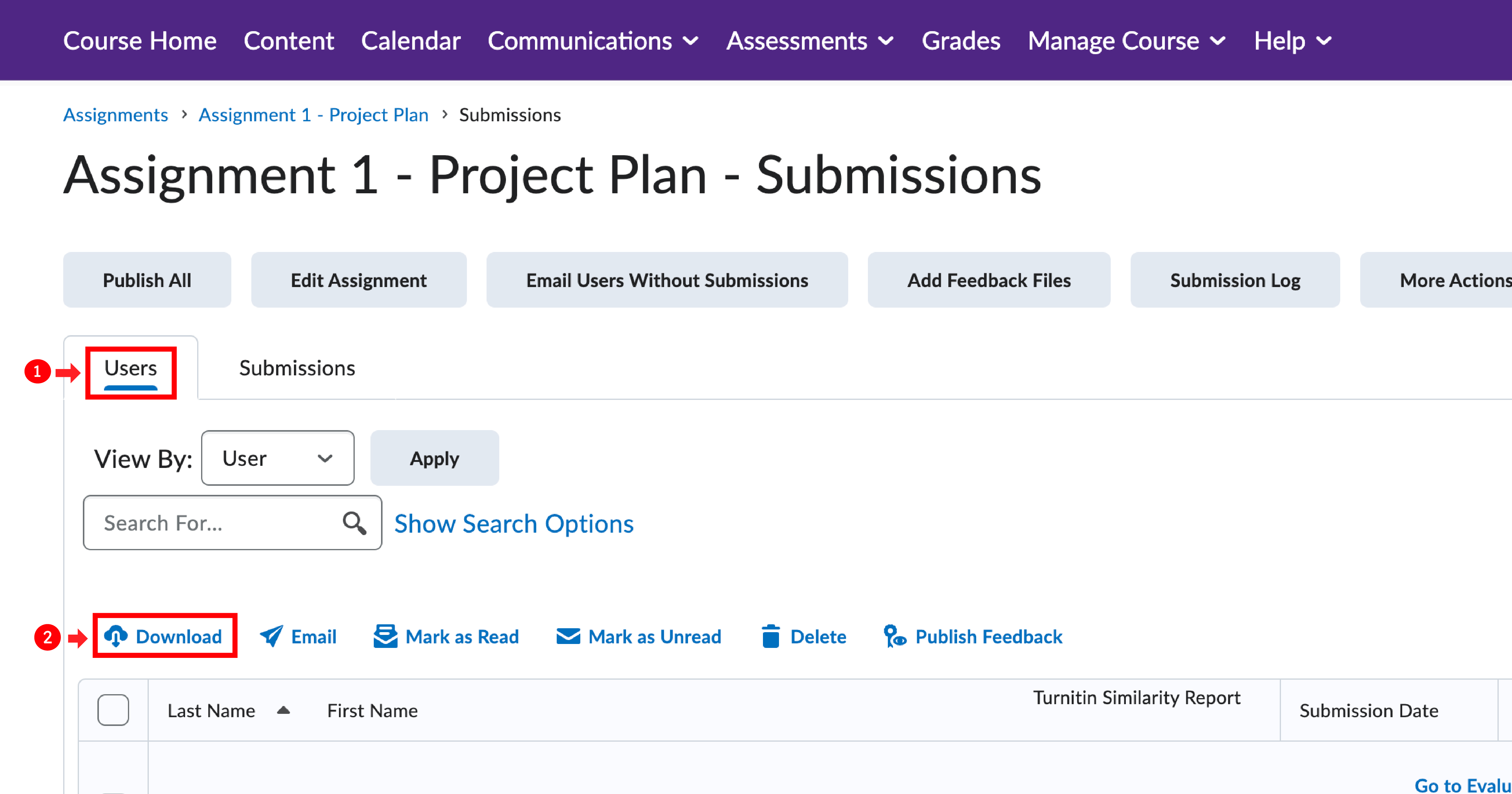 2. Under "Users," select and download all the assignments you need to grade. Within the downloaded zip folder, you will find separate folders for each user. From there, you can either edit each file in a user's folder or add a feedback file.