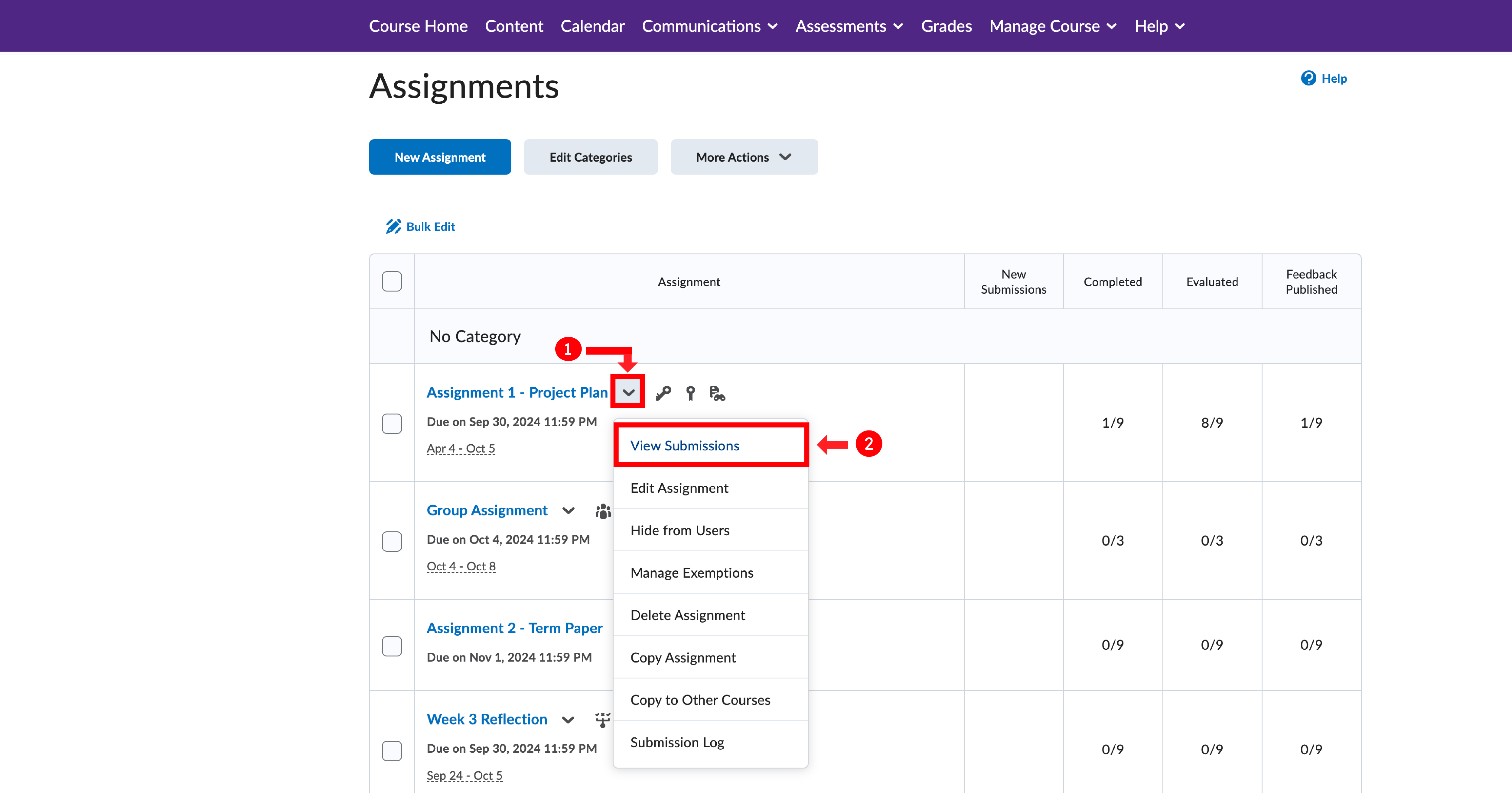 1. To begin, click on "assessments" on the navigation bar, then go to "Assignments," and from there, use the drop-down menu for the specific assignment to navigate to "Submissions."
