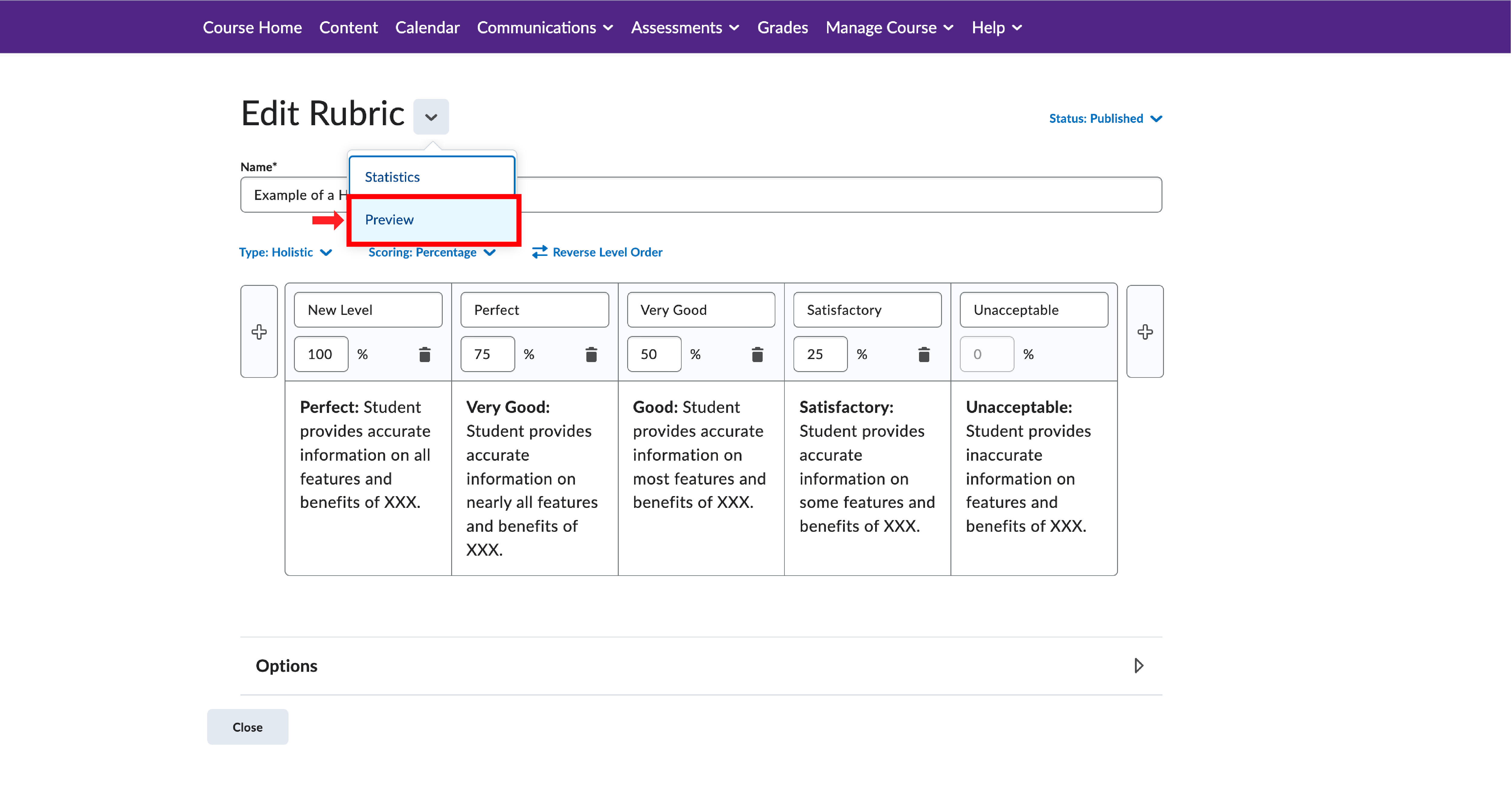 To grade written answer questions in the quizzes tool, select the “Grade” option for the quiz you wish to evaluate. You can attach rubrics to written response questions while creating your quiz to ensure consistency and fairness in your grading.