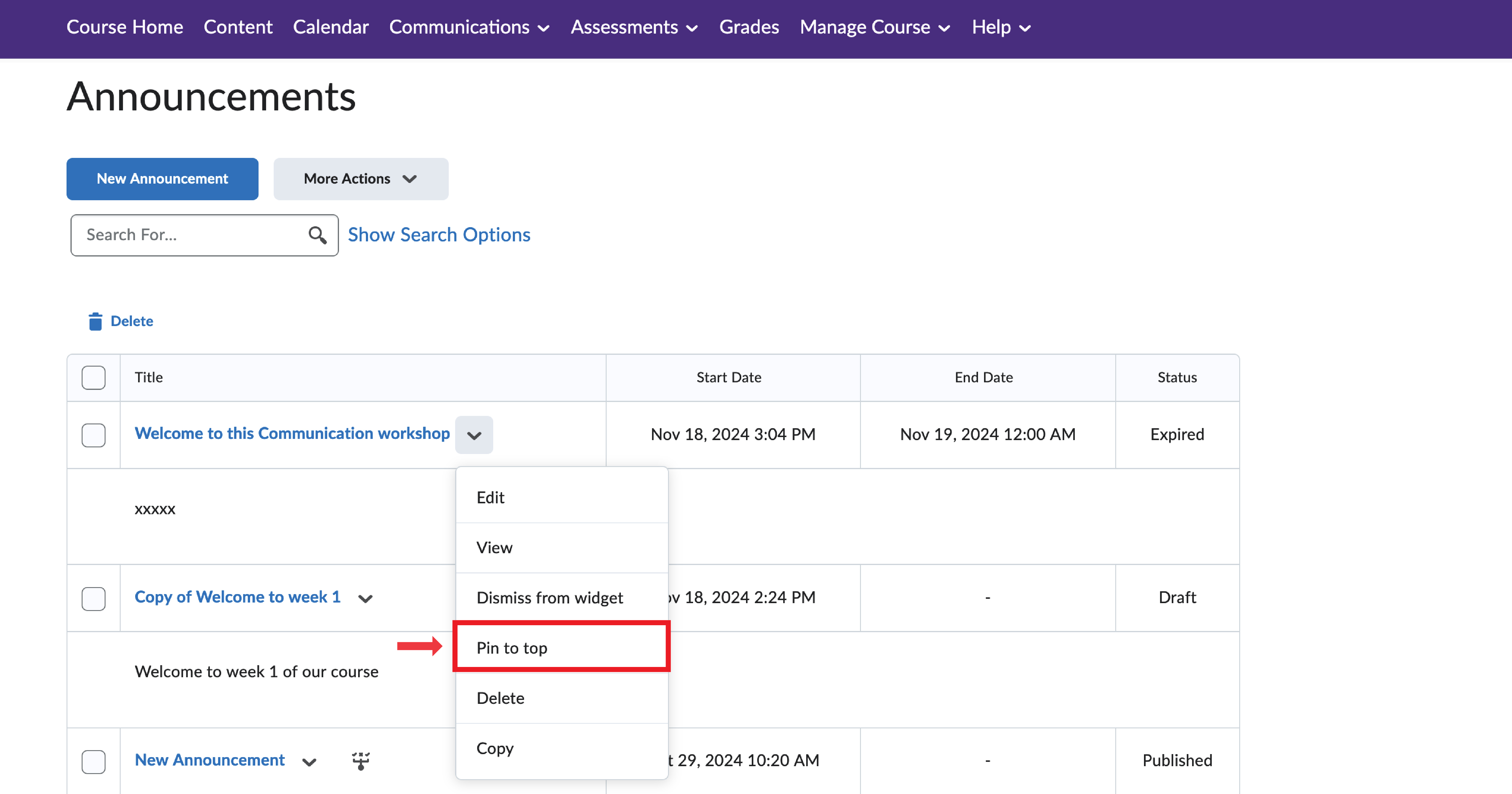 - Then use the pin function from the dropdown to pin the announcement, making it visible once the learners log onto the page.