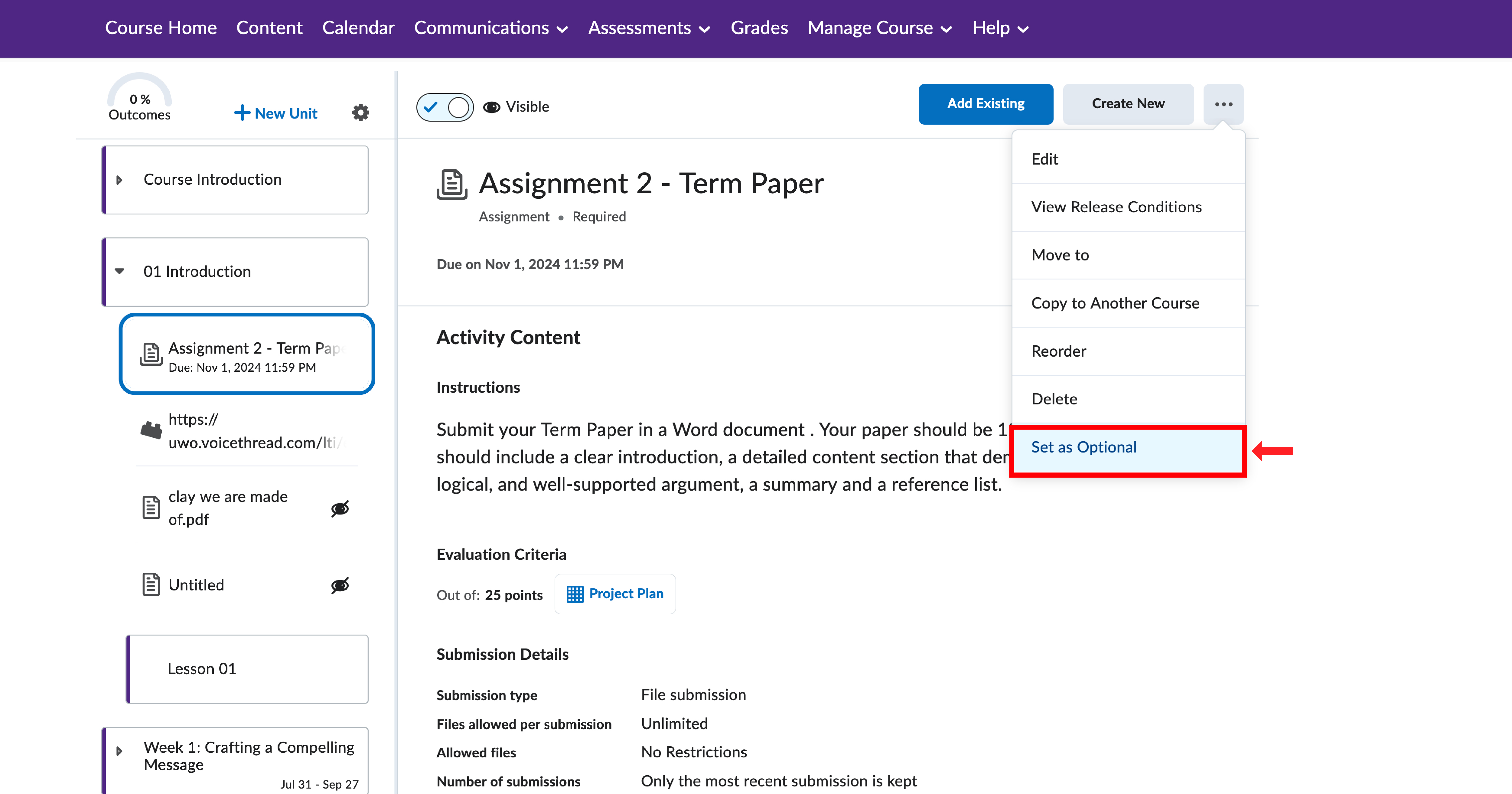 If an instructor prefers not to track a particular content item, they can set it as optional. To do this, follow these steps: