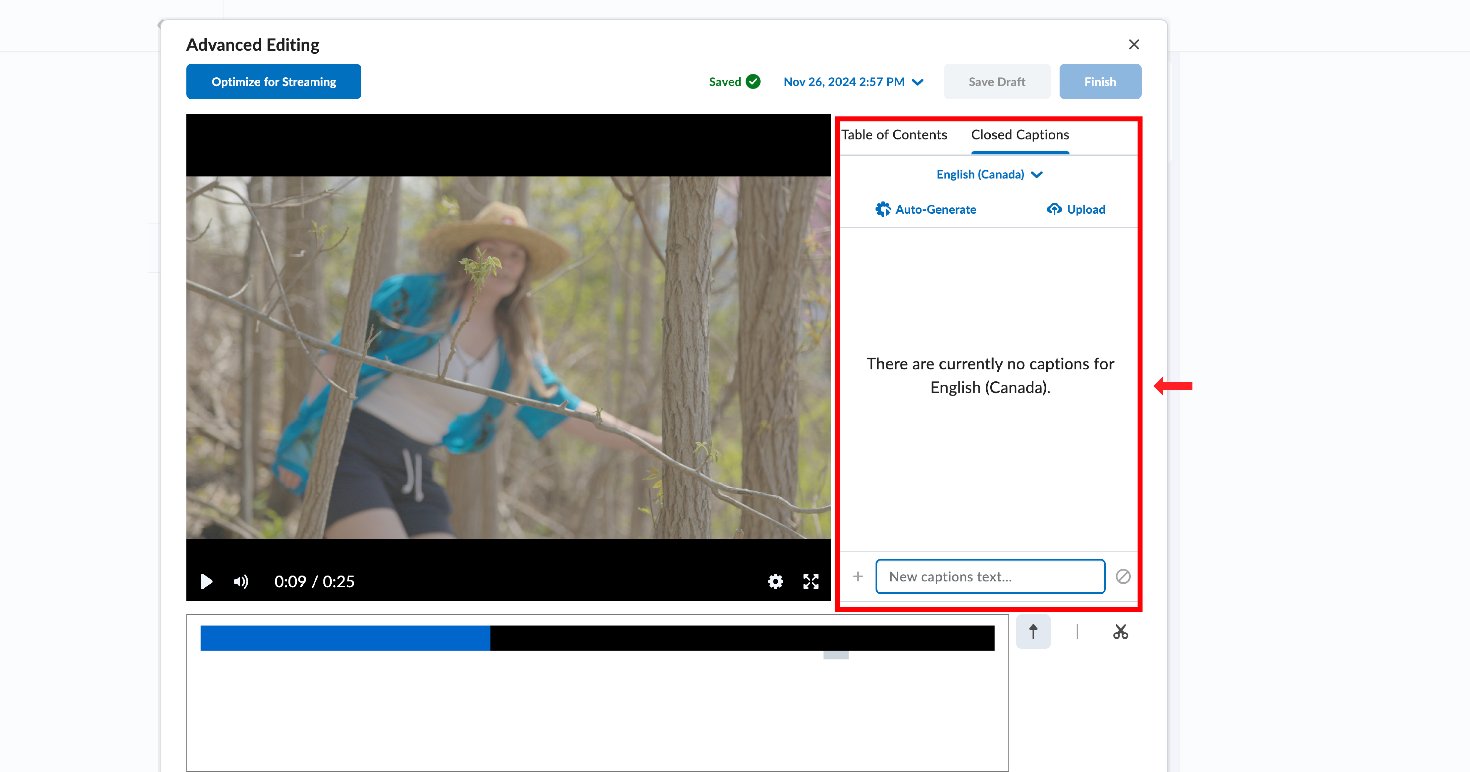 - Brightspace offers the option to automatically generate captions for uploaded videos or allows you to manually upload pre-existing caption files. Users have the flexibility to edit captions.