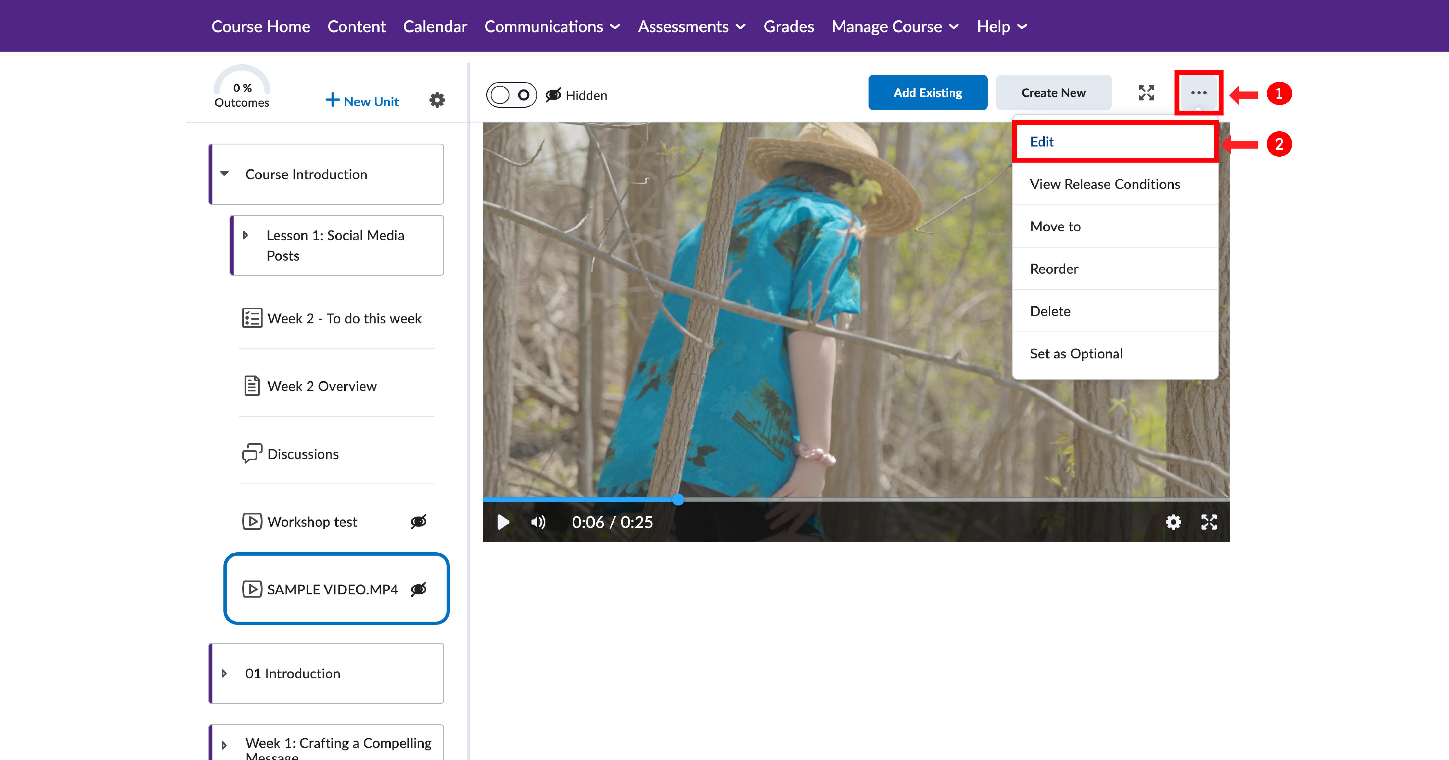 1. On your course page, navigate to the content section and select the specific item you want to make optional.