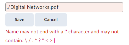 However, Brightspace only displays a notification for some of these characters, not all of them. See the image below. This might cause an issue when adding files from course files to content.