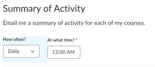 - If you want to receive a summary of activities for each of your courses, you can set up how frequently you'd like to receive it under "how often".